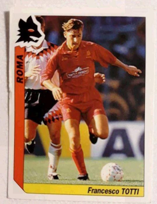 Ma qual è la più bella figurina edita riguardante Totti? A mio personalissimo avviso la Merlin del 1995 (numero 280), la decima (un caso?) delle diciotto dedicate alla squadra giallorossa da quella raccolta, che mostra un Totti giovanissimo con la maglia a laccetti western, una delle più belle indossate in carriera. Si tratta del modello, senza main sponsor, che la Roma vestì nelle prime amichevoli del mese di luglio (forse l'immagine è relativa proprio alla primissima uscita contro il Lavarone del 23 luglio 1994). Ironia della sorte, quella maglia era una numero 9: un ulteriore motivo d'interesse per un campionissimo legato indissolubilmente, invece, alla gloriosa casacca 10.