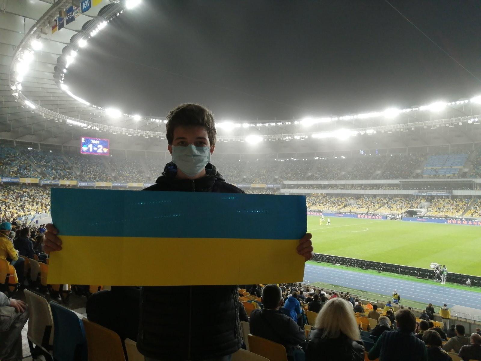 Michael Surzhin allo stadio con la bandiera dell'Ucraina