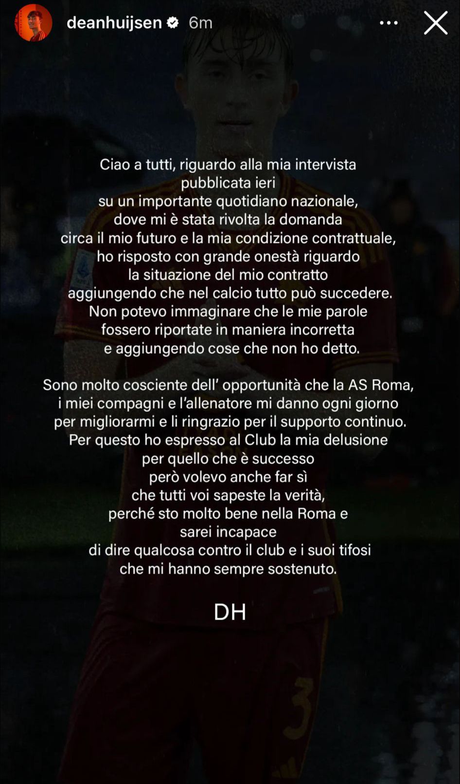 "Ciao a tutti, riguardo alla mia intervista pubblicata ieri su un importante quotidiano nazionale, dove mi è stata rivolta la domanda circa il mio futuro e la mia condizione contrattuale, ho risposto con grande onestà riguardo la situazione del mio contratto aggiungendo che nel calcio tutto può succedere. Non potevo immaginare che le mie parole fossero riportate in maniera incorretta e aggiungendo cose che non ho detto. Sono molto cosciente dell'opportunità che la AS Roma, i miei compagni e l'allenatore mi danno ogni giorno per migliorarmi e li ringrazio per il supporto continuo. Per questo ho espresso al Club la mia delusione per quello che è successo però volevo anche far sì che tutti voi sapeste la verità, perché sto molto bene nella Roma e sarei incapace di dire qualcosa contro il club e i suoi tifosi che mi hanno sempre sostenuto".