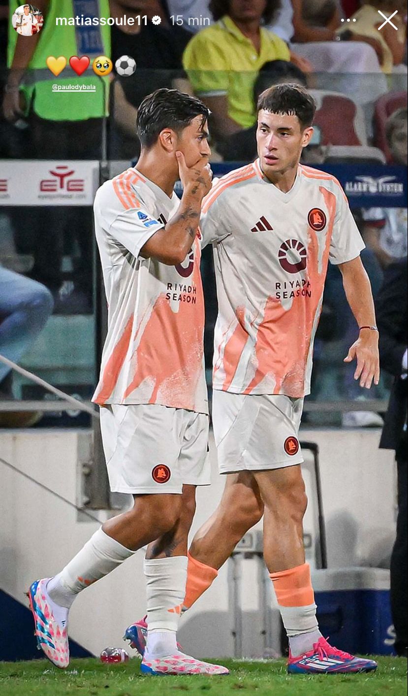 Due emoticon e i cuori giallorossi: quanto basta per esprimere lo stato d'animo dopo la notizia della permanenza di Dybala. Ecco la foto pubblicata da Soulé.