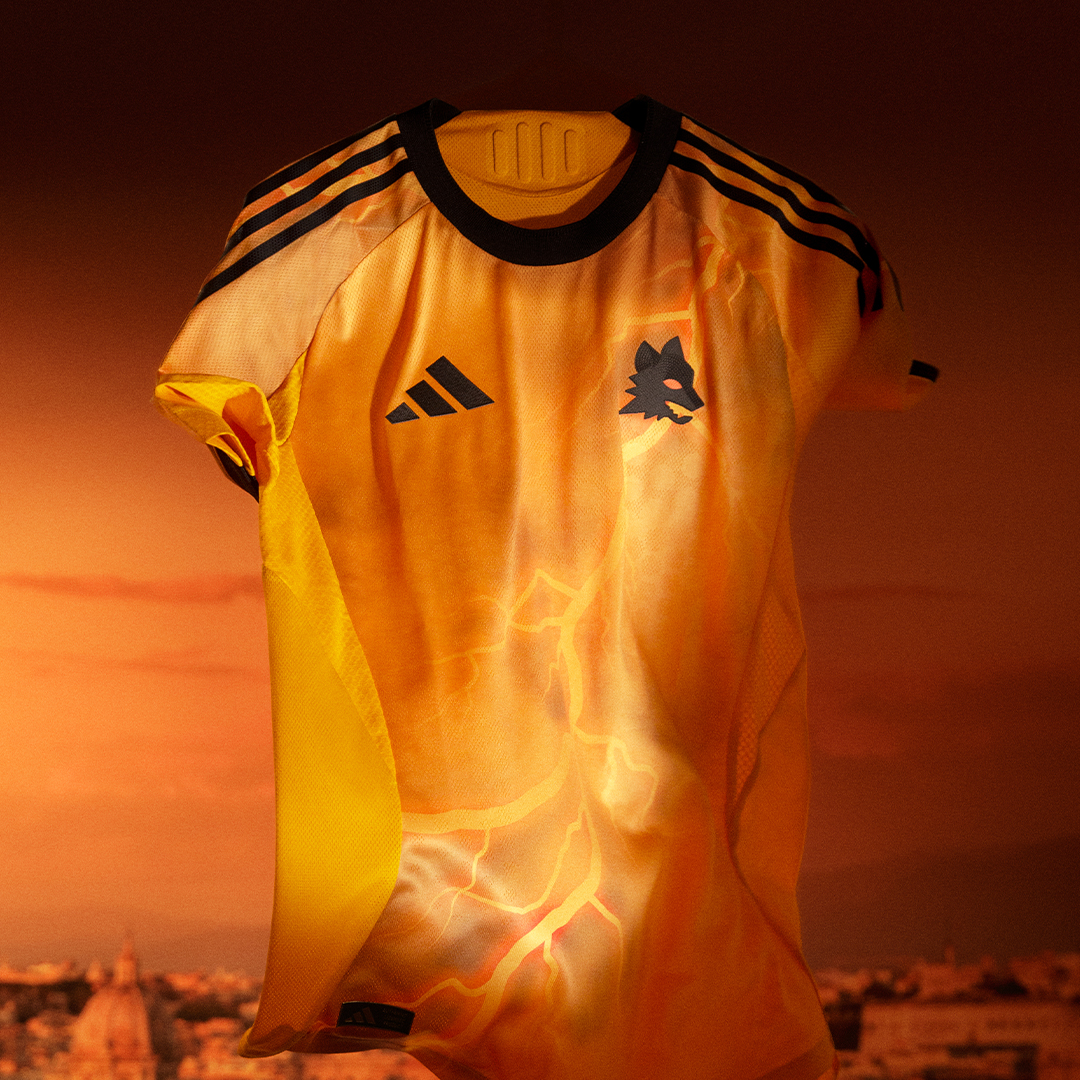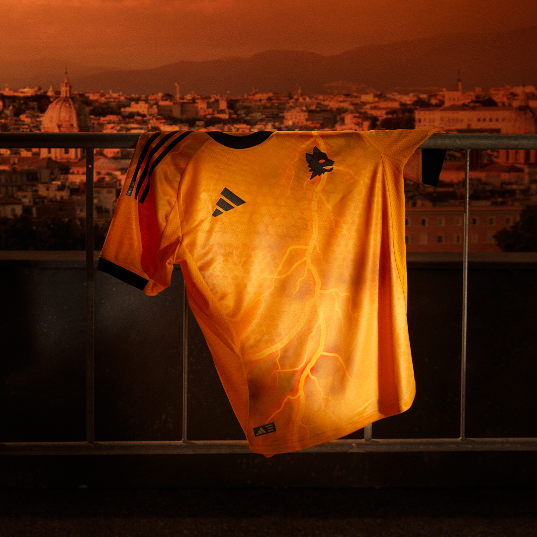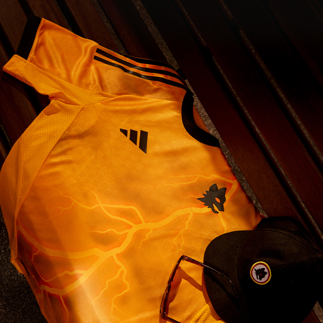 Impatta subito all'occhio il fulmine presente sulla maglietta che, come si legge nel comunicato del club, "incarna la potenza e la maestosità dell’Antica Roma attingendo dal mito che avvolge la storia ultramillenaria dell’Urbe". Più in alto è ben visibile il Lupetto di Gratton in nero, così come il logo e le tre strisce iconiche di Adidas.