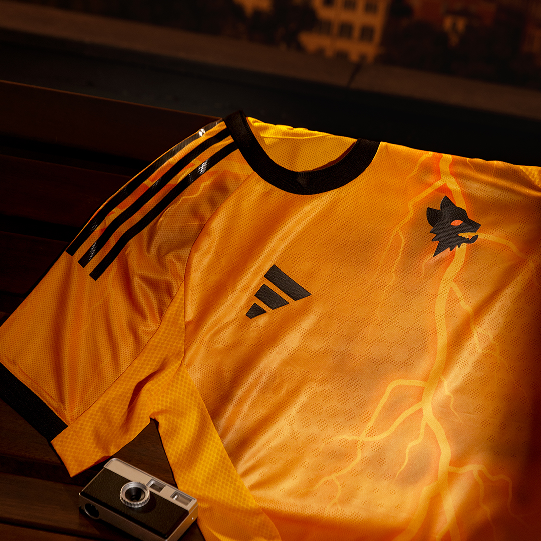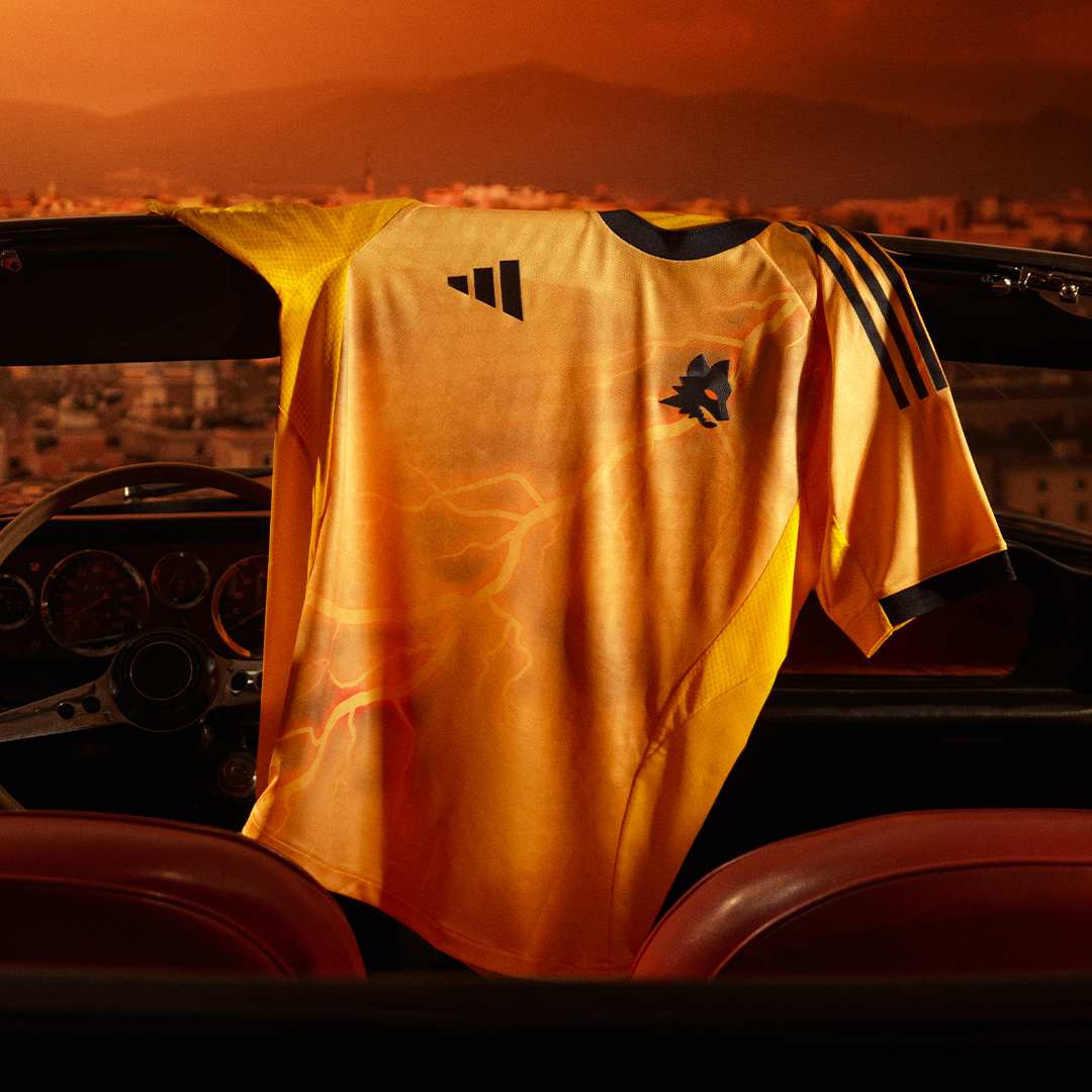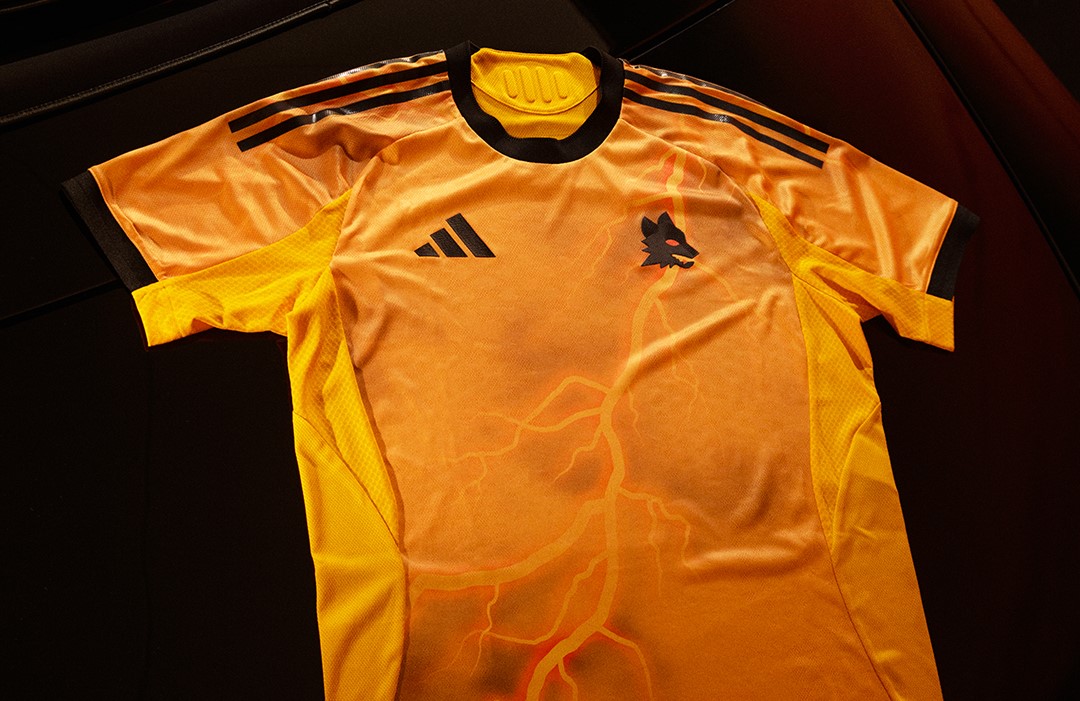 Impatta subito all'occhio il fulmine presente sulla maglietta che, come si legge nel comunicato del club, "incarna la potenza e la maestosità dell’Antica Roma attingendo dal mito che avvolge la storia ultramillenaria dell’Urbe". Più in alto è ben visibile il Lupetto di Gratton in nero, così come il logo e le tre strisce iconiche di Adidas.