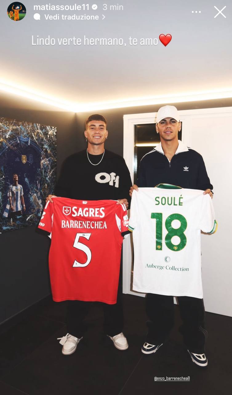Attraverso una storia condivisa su Instagram, Mati Soulé ha mostrato lo scambio di maglie avvenuto con il calciatore del Benfica Barrenechea, suo grande amico ed ex compagno di squadra quando entrambi erano alla Juventus.