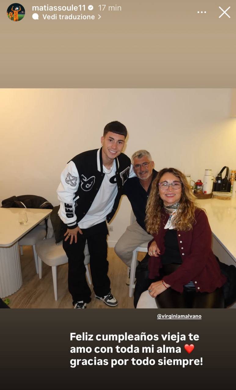 Attimi di amore e tenerezza sul profilo Instagram di Matias Soulé, che ieri sera, contro il Parma, ha visto togliere il suo gol a causa del fuorigioco di Zeki Celik. Sui social, l'attaccante argentino ha voluto augurare un buon compleanno a sua madre con uno scatto e un messaggio.