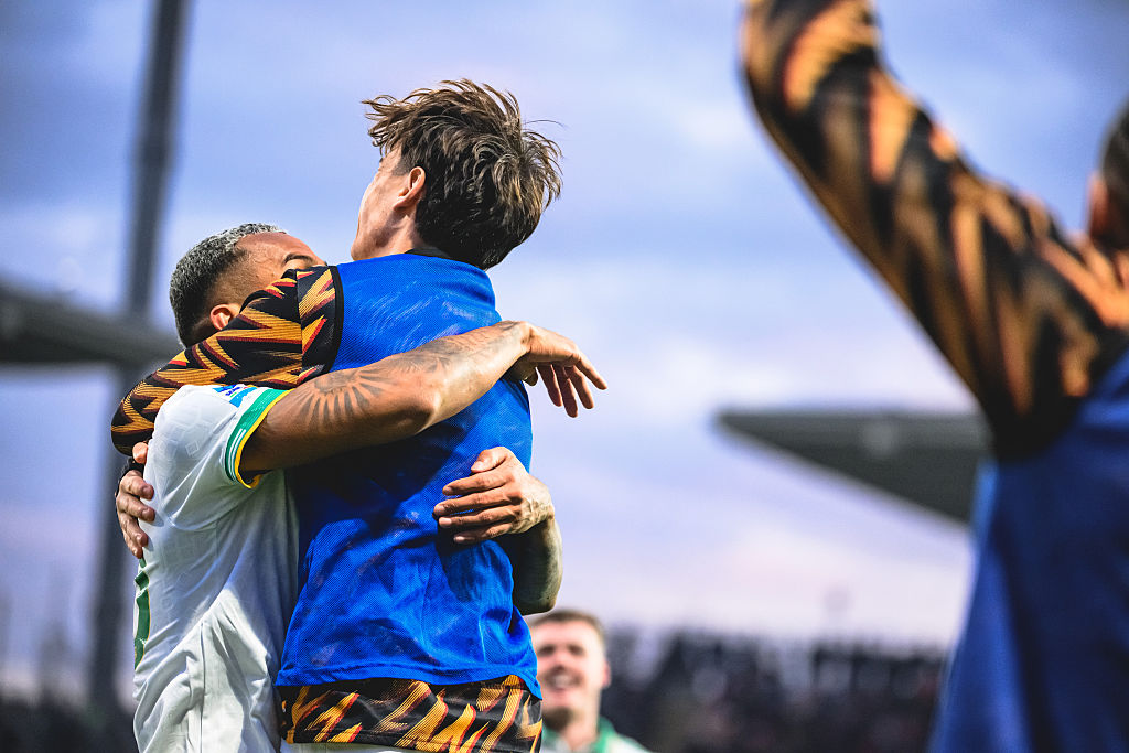 Grande gioia per il laterale brasiliano, al secondo sigillo stagionale. Dopo la bella rete, realizzata con un tocco morbido su Audero, prende la rincorsa per abbracciare Pisilli, venendo successivamente accolto dal resto dei compagni. Una giornata speciale.