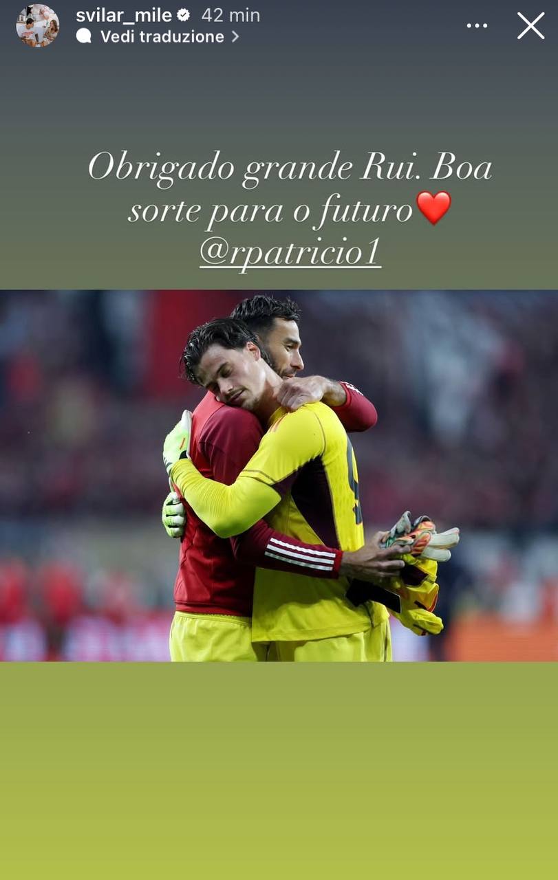 L'addio al calcio di Rui Patricio tocca anche la Roma. Oltre alle parate fondamentali in finale di Conference League, il portiere portoghese è stato anche protagonista del "passaggio di testimone" a Mile Svilar. Che oggi, tramite le sue Instagram stories, ha celebrato l'ex giocatore.