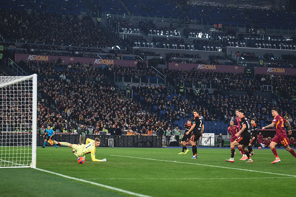 Nel primo tempo la feroce determinazione della Roma ha portato la gara esattamente dove l’aveva immaginata Gasperini, così in cronaca l’unica traccia degli ospiti è stata lasciata a pochi secondi dal termine del tempo, con una punizione calciata in area e un paio di rimpalli che avevano portato Douvikas a contatto con Svilar, come al solito coraggioso e tempestivo a buttarsi sui piedi dell’avversario e ad impedire quella che sarebbe stata una vera beffa. Perché fino a quell’episodio isolato, la Roma aveva costruito almeno una decina di potenziali occasioni da gol, a volte sprecate per approssimative rifiniture o per conclusioni fuori misura. Ha cominciato Wesley all’11’ con uno dei pochi cross azzeccati dal fondo per la testa di Ferguson sul secondo palo, bravo a schiacciare verso l’angolo opposto, ma bravo pure Kempf a respingere di piede. Al 17’ su punizione di Pellegrini Hermoso ha provato a segnare di testa, ma ha guadagnato solo un corner. Al 22’ uno spunto travolgente in velocità di Wesley ha portato la Roma a poter sfruttare un promettentissimo 3 contro 2, giocato male però dall’esterno brasiliano con un passaggio addosso alle gambe del difensore più vicino. Al 24’ Cristante ha rubato uno dei centomila palloni della sua partita e ha servito Soulé che ha cercato di restituire l’assist, anche stavolta senza fortuna. Al 25’ un’altra rapina a piede armato di Cristante ha rilanciato una transizione passata per i piedi di Koné, Hermoso, poi Soulé (primo tiro respinto), ancora Soulé per lo scarico a Wesley che da buona posizione e con ampie frazioni di porta disponibile ha tirato (malissimo) di sinistro, mandando alto. Al 27’ è stato ancora Soulé a ripartire verso la porta di Butez, ma il suo pallonetto verso il secondo palo è sfilato fuori. E ancora (29’) Pellegrini e Koné hanno duellato dopo l’ennesimo pallone rubato, per servire pulito Soulé che si è aggiustato il pallone sulla sua mattonella preferita dentro l’area, ma ha poi trovato ancora sulla traiettoria qualche tibia avversaria. Al 30’ un doppio episodio ha attizzato gli animi: Ndicka ben servito in area ha subito un contrasto che l’ha mandato a terra dando a molti suoi compagni di squadra l’idea che ci fosse stato un classico pestone da vivisezionare al Var (ma le riprese hanno depenalizzato il duetto) e sulla ripartenza Diao si è lasciato alle spalle Cristante e ha saltato netto anche Wesley, prima di arrendersi però a Rensch e a un risentimento muscolare che dopo sette minuti l’ha spinto a chiedere il cambio. E prima della pausa ci hanno provato ancora Ferguson due volte (in due minuti) e Pellegrini, con un tentativo di conclusione acrobatica.