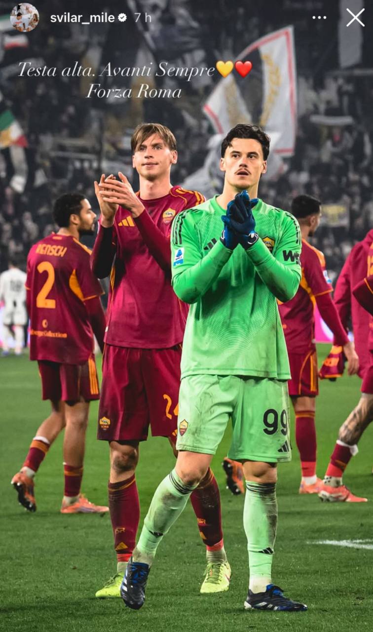 Mile Svilar non molla. Nonostante il ko in casa della Juventus. Al termine della sfida dell'Allianz Stadium, in cui è risultato decisivo con parate e uscite provvidenziali, il portiere della Roma ha condiviso un messaggio sulle sue Instagram stories, accompagnato da uno scatto che ritrae se stesso e Jan Ziolkowski a fine gara.