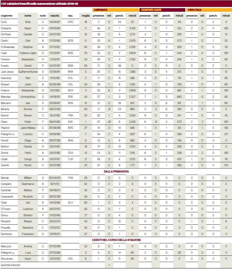 Ventisette giocatori utilizzati, 35 convocati, 37 con un numero di maglia (il quinto portiere Cardinali e il difensore francese Bianda, arrivato con ben altre aspettative, sono gli unici mai chiamati per una gara ufficiale): sono le cifre della Roma, nella stagione appena conclusa. Curiosamente molto simili a quelle della stagione precedente: anche lo scorso anno i giallorossi utilizzarono 27 giocatori in gare ufficiali, e ne inserirono 10 in più - attingendo alla formazione Primavera - nella numerazione (che in entrambi i casi si conclude con la 92 di El Shaarawy).