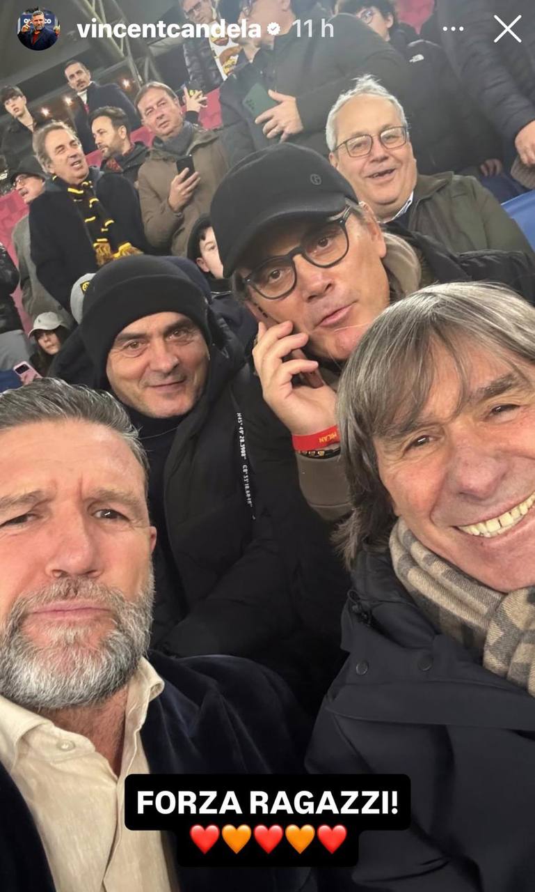 Quattro tifosi d'eccezione allo Stadio Olimpico, quattro volti storici della storia Romanista. In occasione del pareggio arrivato contro il Milan, Vincent Candela ha condiviso un selfie direttamente dalla tribuna dell'Olimpico in compagnia di alcuni amici "speciali" per tutti i tifosi della Roma.