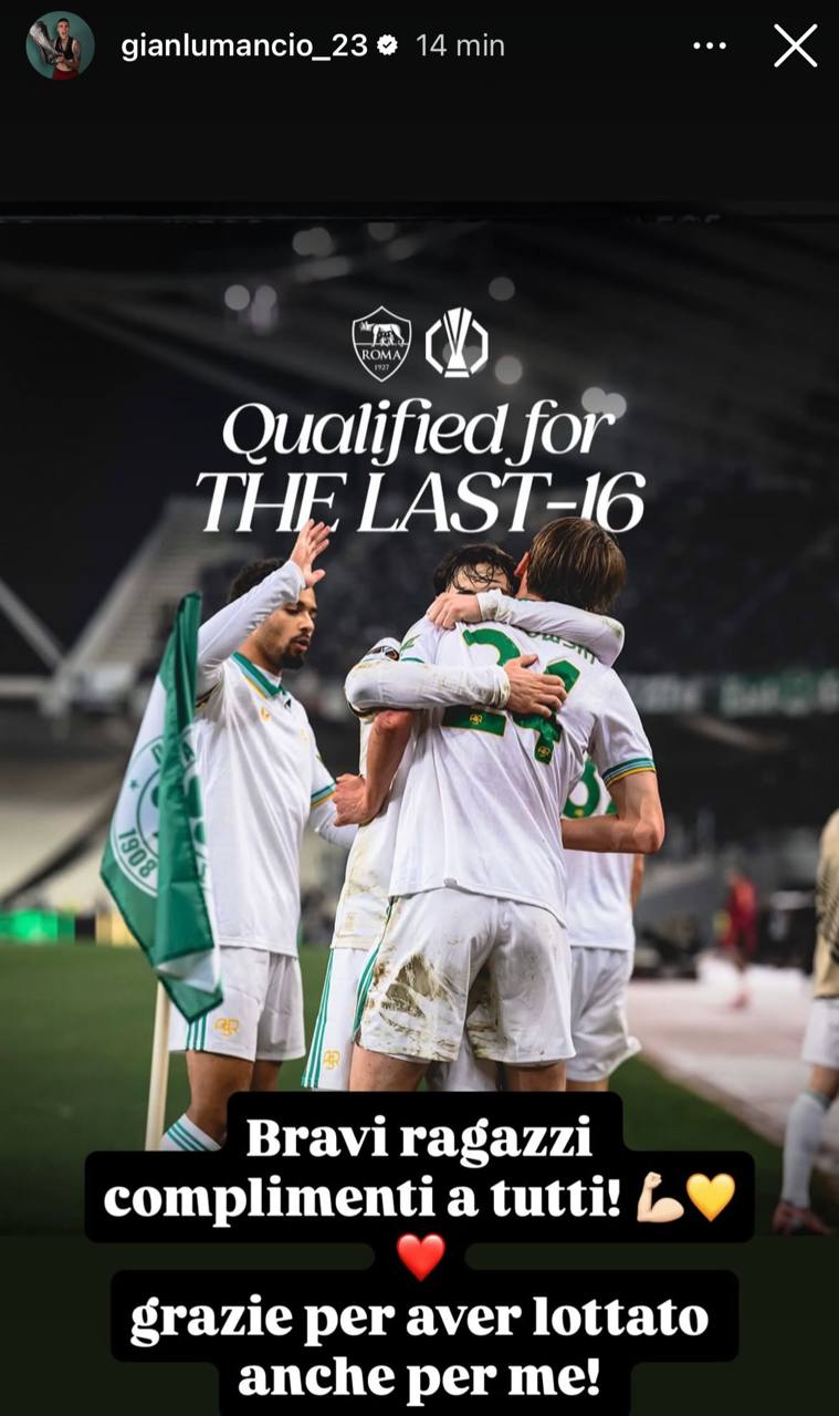 Espulso al 15' contro il Panathinaikos nell'ultima sfida di Europa League, Gianluca Mancini ha ringraziato i suoi compagni con una bella storia condivisa sui social: "Bravi ragazzi, complimenti a tutti! Grazie per aver lottato anche per me".