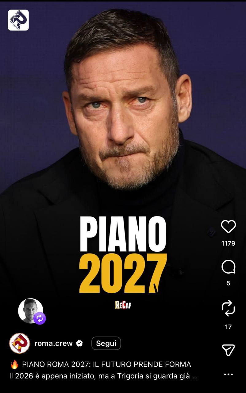 Il repost social di Totti: “Ecco il piano della Roma per il centenario”