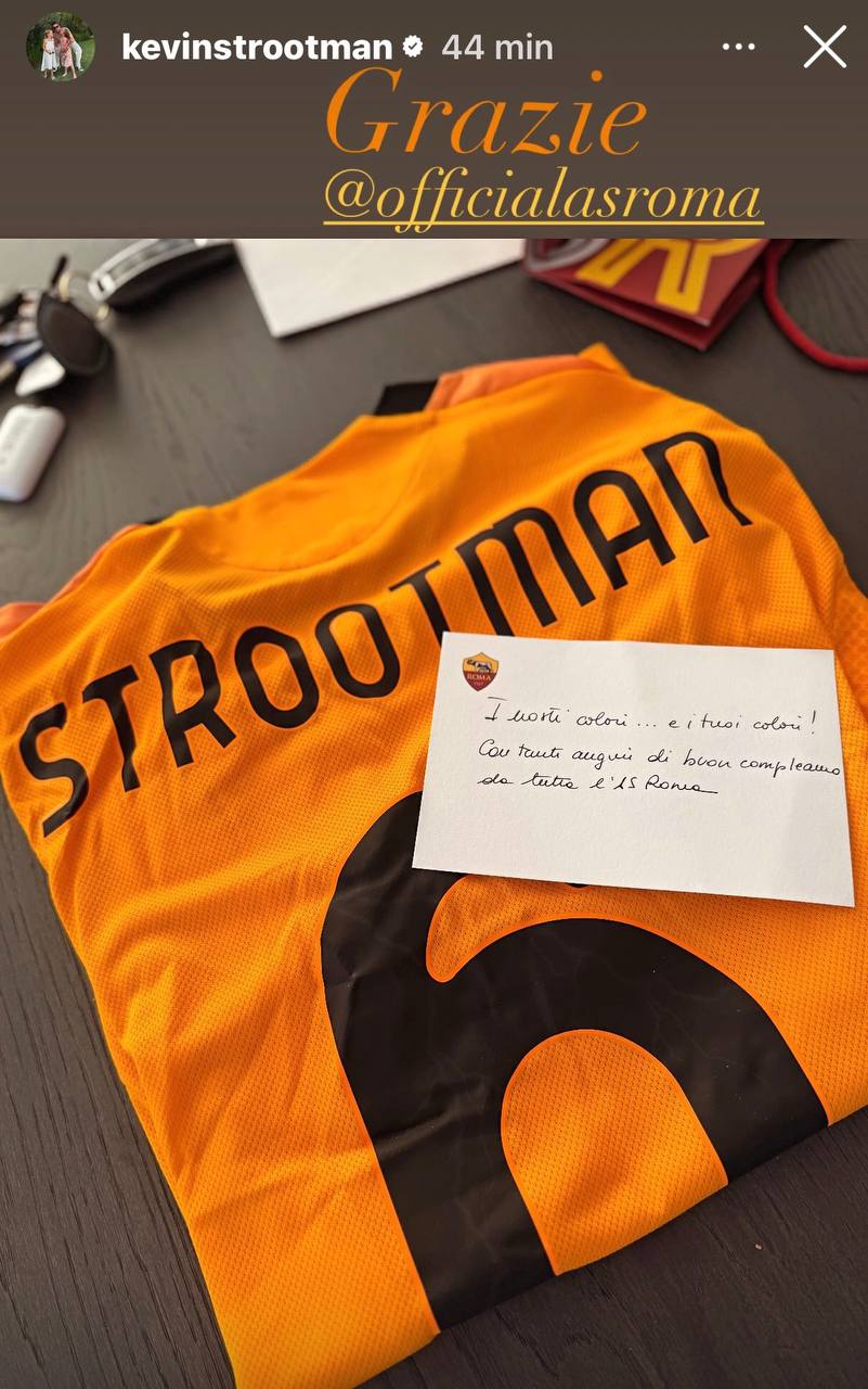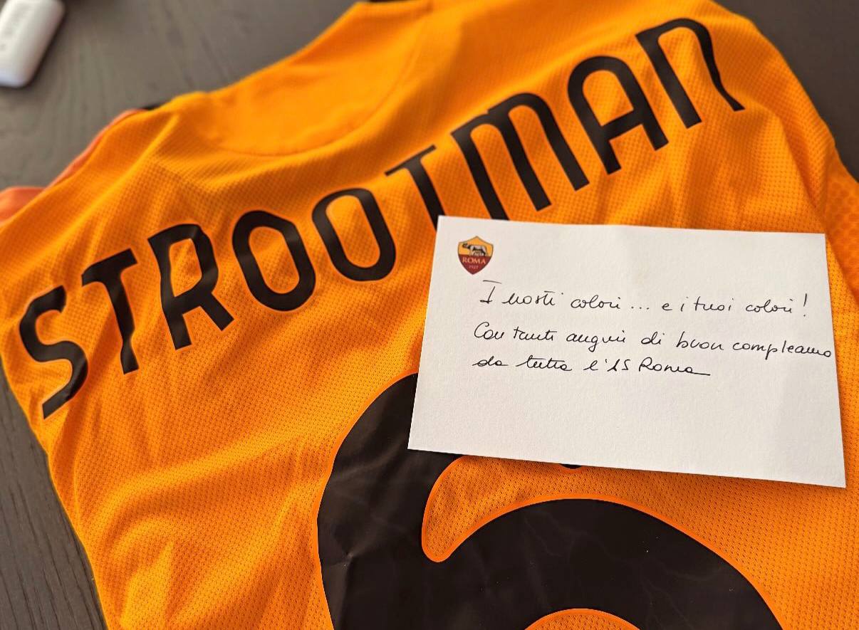 Sulle sue storie Instagram, Strootman ha condiviso il dono del suo ex club: la seconda maglia della stagione 2025-26 personalizzata con nome e numero, più una lettera con dedica. "I nostri colori... e i tuoi colori! Con tanti auguri di buon compleanno da tutta l'AS Roma", il contenuto. A seguire, i ringraziamenti.
