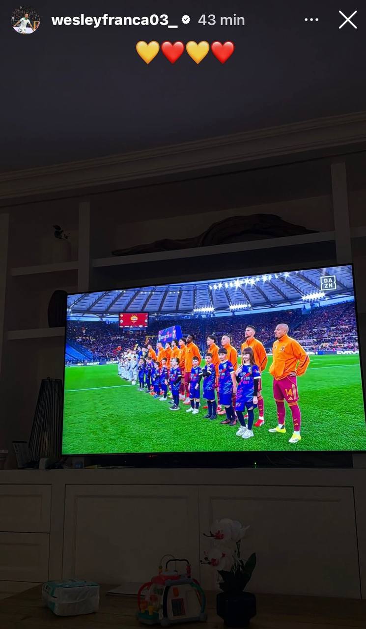 Wesley non c'è col Lecce, ma non per questo si fa da parte. Durante la sfida di campionato in corso allo Stadio Olimpico, il laterale brasiliano ha infatti condiviso una storia sul suo profilo Instagram in cui vengono mostrato gli istanti precedenti alla partita coi salentini. Il tutto accompagnato dai soliti cuori giallorossi.