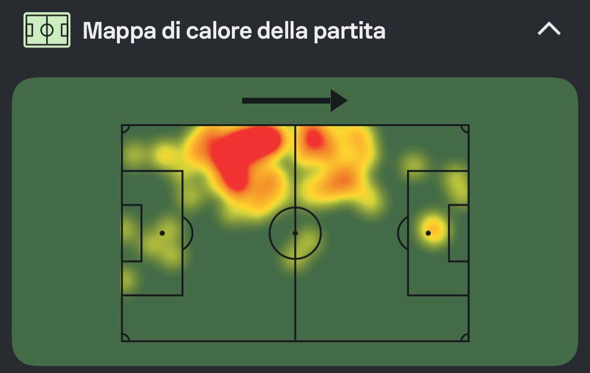 A partire dalla heatmap, che certifica la presenza costante sul lato destro del campo, sia in posizione arretrata, sia più avanti.