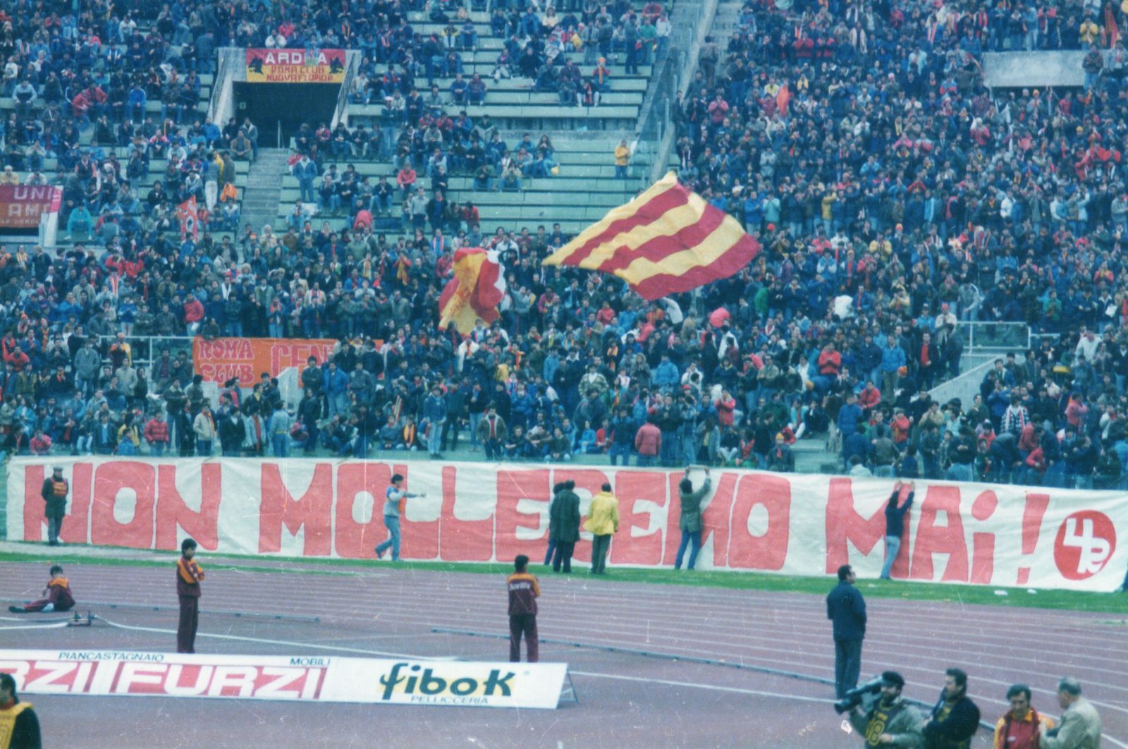 E lì, in quella curva, avevano visto la festa Scudetto e le notti di Coppa e dei Campioni… Credo che sia perfetta questa partita per raccontare di come il tifoso romanista, quando è spacciato (Juve Mondiale, campionato già da archiviare, Falcao e Agostino lontani già da un po’ così come un’epoca di sogno che sembrava essere finita col Bayern Monaco mesi prima), vince. O stupisce. Ma tanto. Roba da pupette con la bocca aperta. Mai sentito un tifo così, mai sentito un coro tanto ripetuto come quello. Mai. E “mai molleremo mai” significava tutto questo. C’era persino scritto in Curva Sud: NON MOLLEREMO MAI, firmato Ultrà Roma 77. E quello è stato uno spettacolo d’amore, ma non fine a sé stesso: da quel pomeriggio partì la rincorsa alla Juve Superstar e super campione dei supercampioni, raggiunta esattamente un girone dopo proprio col Pisa, a Pisa, in classifica, e battuta 3-0 all’Olimpico anche in 10 contro 11. Quella rimonta che la Roma ha fatto somiglia tanto all’incessante susseguirsi di quel coro: «Alé forza la Roma alé, forza la Roma alé, forza Roma alé, Roma alé, Roma alé». Dai su! Più forte!! Sempre.