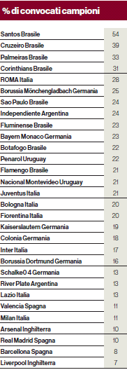 Inoltre i giallorossi guidano i club europei nella speciale classifica stilata tenendo conto della relazione fra convocati e campioni: la percentuale dei giallorossi è del 28%, tre punti in più rispetto al Borussia Mönchengladbach, che segue con il 25%. La Roma, in generale, è la quinta squadra al mondo, e segue il quartetto delle squadre brasiliane che hanno svolto la funzione di serbatoio per i successi della Seleção tra il 1958 e il 1970: Santos, Cruzeiro, Palmeiras e Corinthians. La squadra di Pelé è in cima alla classifica, con un impressionante 54%.
