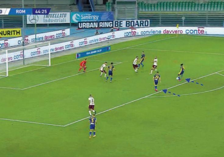 La seconda immagine si riferisce invece ad una caratteristica che contraddistingue il Verona di Juric: la capacità dei loro centrocampisti di arrivare a rimorchio degli attaccanti in gran corsa, che se è unita all'incapacità dei centrocampisti della Roma di marcare queste folate degli avversari, fa alzare a livello di guardia l'allarme per quello che potrà accadere contro i veneti, bravissimi a giocare per tutto il campo in non possesso con l'uno contro uno e poi a ribaltare l'azione a massima velocità. L'azione mostrata qui sopra finì con la conclusione di Tameze sulla traversa, ma solo grazie ad una istintiva deviazione di braccio di Mirante. La partita finirà poi 0-0, poi corretto in 3-0 a tavolino per il pasticciaccio regolamentare della posizione di Diawara.