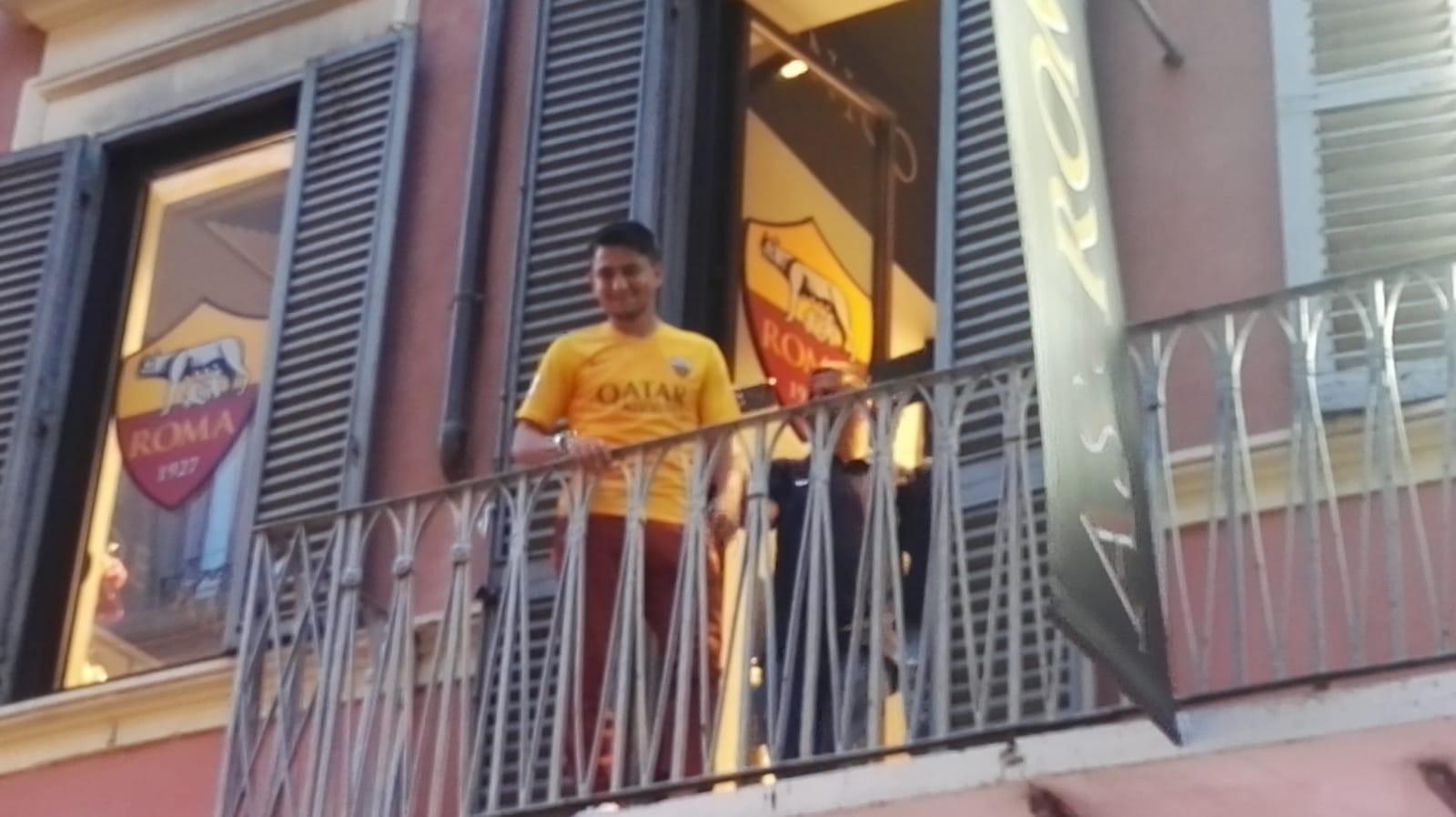 19.30 - Ünder esce dal balcone del Roma Store per salutare i tifosi rimasti fuori