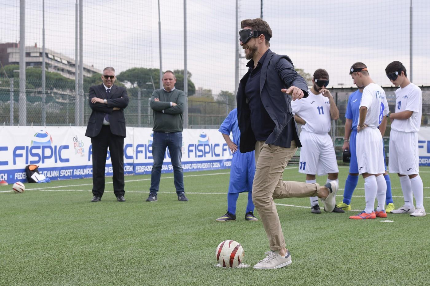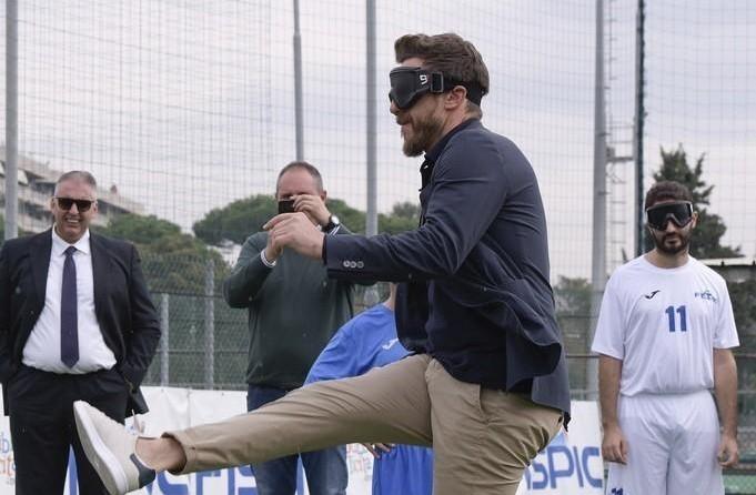 FOTO - Di Francesco batte i rigori bendato con i ragazzi ciechi