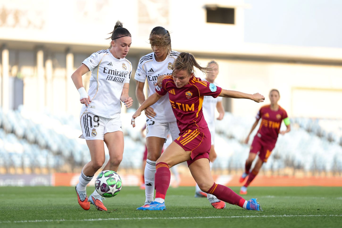 Rischiava di essere una sfida impari e così è stato. La Roma ha perso in casa del Real Madrid con un sonoro 2-6 nella prima giornata della Fase Campionato. Risultato a parte, la prestazione romanista ha dato qualche buon segnale, ma il dislivello di individualità, qualità e soprattutto ritmo è stato piuttosto palese dall’inizio alla fine della sfida. La squadra di Rossettini ha sofferto la pressione spagnola da subito e dopo 6’ ha pagato col gol del vantaggio del Real firmato Redondo sugli sviluppi di un angolo dopo un brutto errore di Baldi (titolare con Lukasova infortunata). Le giallorosse ci hanno messo un po’ ad alzare la testa ma al 15’ si è accesa Haavi che dopo una sgasata sulla sinistra ha messo un tiro cross verso la porta, su una smanacciata di Frohms è arrivata Pilgrim, tocco al volo per Viens e colpo di testa per l’1-1. Improvviso, ma anche effimero, perché il Real ci ha messo pochissimo a rialzare la pressione, mettere in difficoltà la difesa giallorossa che ha pian piano perso di lucidità e trovare, esattamente 7’ dopo la rete del 2-1 con Weir. Il secondo lampo della Roma (e l’ultimo davvero pericoloso) è arrivato al 35’: ancora Haavi dalla sinistra, che stavolta è rientrata sul destro e ha fatto partire una conclusione meravigliosa per il temporaneo 2-2. La doppia reazione poteva dare fiducia alla squadra di Rossettini, che dalla panchina ha provato a dare indicazioni costanti di pressing e gestione del campo, ma ancora una volta la differenza l’ha fatta il ritmo, con il Real a un livello cui la Roma oggi non può oggettivamente arrivare. Anche il 2-2 è durato solo 6’, perché al 42’ Redondo ha siglato il 3-2 sfruttando un buco lasciato al centro della difesa della Roma, un errore imperdonabile che poi ha probabilmente compromesso il resto della prestazione del reparto tutto.