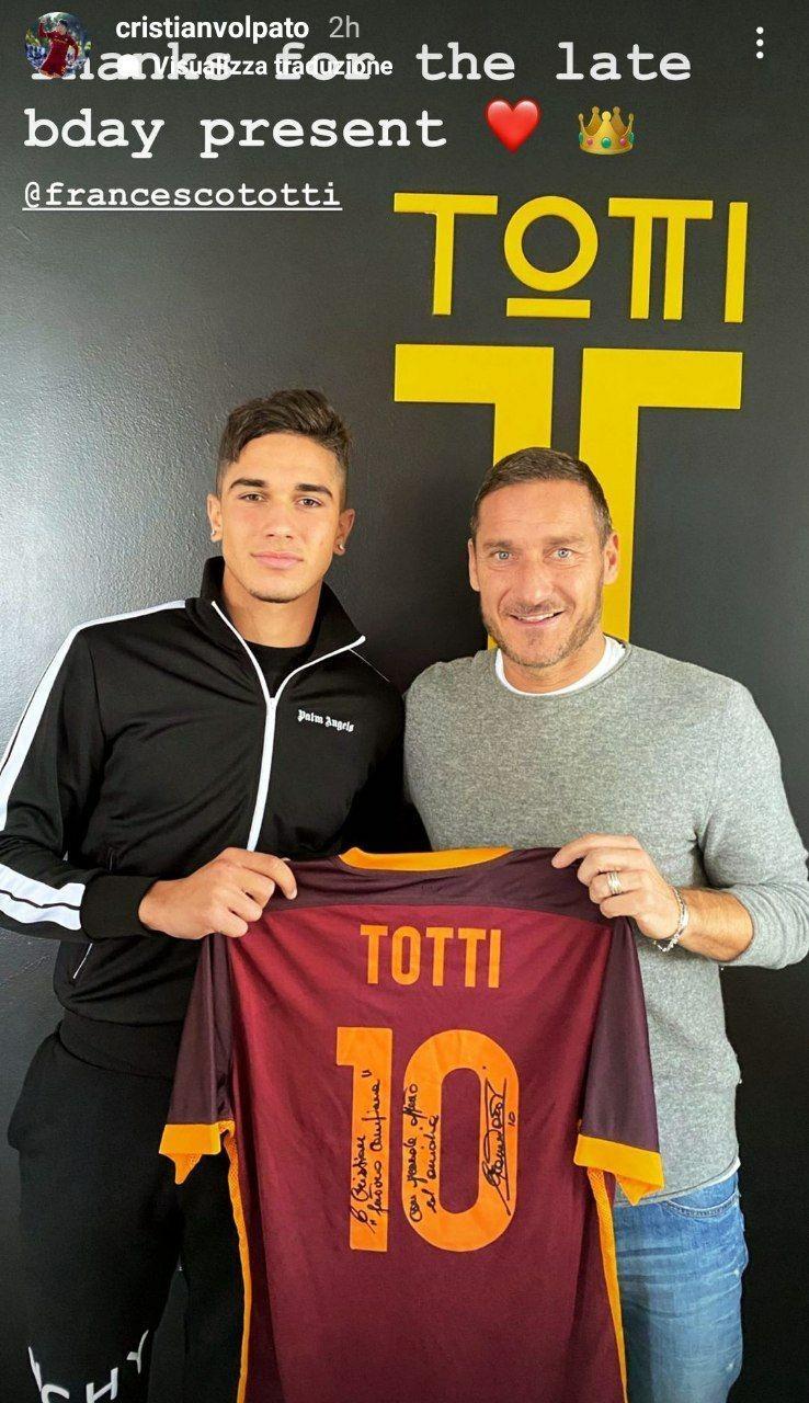 Regalo speciale per Cristian Volpato, classe 2003 della Roma Primavera, che José Mourinho ha già convocato con la Prima Squadra. Il giovane calciatore, assistito dalla CT10 Management di Francesco Totti, ha ricevuto una maglia autografata dal Dieci, con una dedica speciale: "A Cristian, futuro campione", si legge sulla maglietta firmata dallo storico capitano giallorosso. "Grazie per il regalo di compleanno in ritardo", ha scritto Volpato, che il 15 novembre scorso ha compiuto 18 anni, sul proprio profilo Instagram, dove ha pubblicato la foto con Totti e con la maglietta ricevuta.