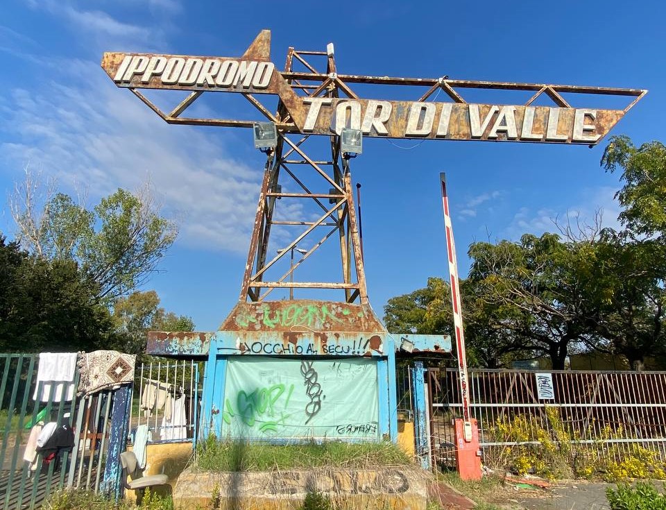 Via dell’Ippica, ormai, è chiusa, transennata. D’altronde qui è tutta zona privata. Un tempo dell’imprenditore Papalia, poi di Parnasi e infine di Vitek, magnate ungherese che si è assicurato il terreno nel 2020, dopo i problemi giudiziari del suo predecessore. Ci si può entrare soltanto a piedi e lo scenario che ci si apre di fronte è desolante. Sullo sfondo, il grande cancello sovrastato dall’arruginita insegna «Ippodromo Tor di Valle» è ormai adibito ad accogliere panni e tappeti, da asciugare al sole, di chi in modo abusivo occupa quel luogo un tempo location di “Febbre da cavallo”. A terra la scritta in rosso: «Lasciate ogni speranza o voi ch’entrate». La vegetazione cresce incontrastata, affossata solo in alcuni punti da mucchi di rifiuti di ogni genere. Da elettrodomestici a indumenti, fino a sedie e materassi. La zona è abitata da un accampamento nomade, con docce di fortuna e capanne tirate su alla buona. Alcuni dettagli per terra lasciano intuire che anche di notte il luogo sia frequentato per attività diversificate. Il grande muro che circonda l’ex ippodromo è ormai consumato e gli spazi vuoti permettono di scorgere, in lontananza, le due tribune di Lafuente. Hanno vinto loro, non sono state demolite da una ruspa, ci sta pensando il tempo a farle cadere pezzo dopo pezzo.