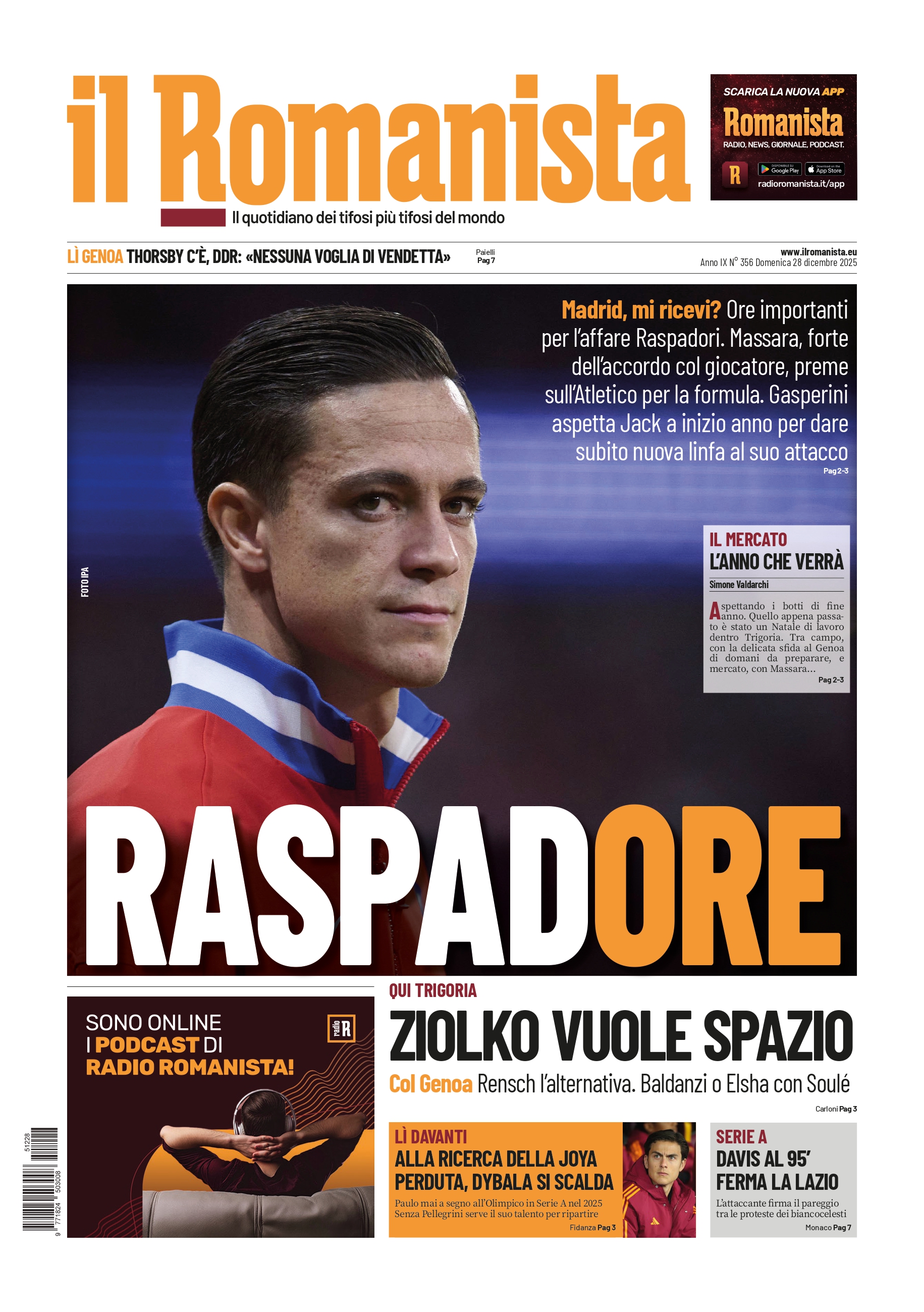 AS RomaLa giornata giallorossa - Gasperini: "Dovbyk out col Genoa". Previsto un colloquio tra Raspadori e Simeone28/12/2025 - 20:00