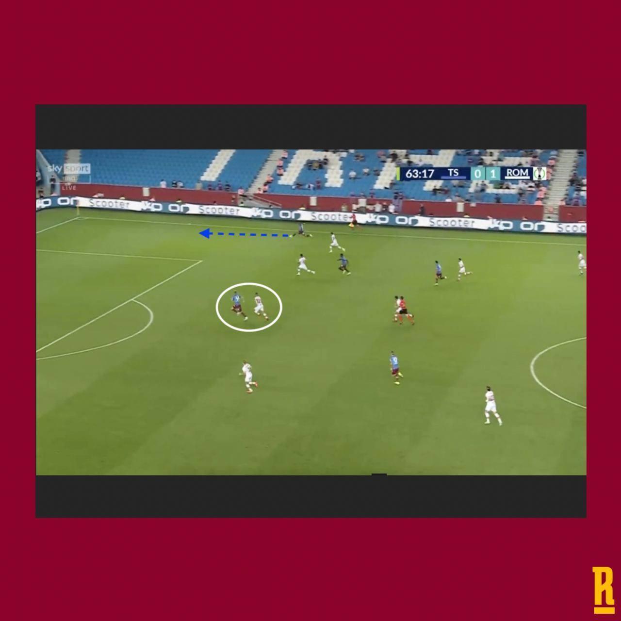 Nell'azione del gol subito, la Roma si fa infilare per la prima volta alle spalle