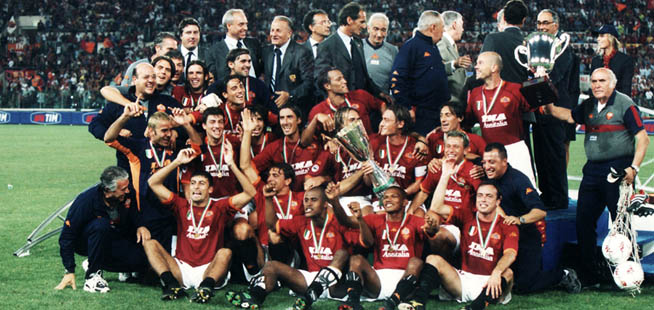 E sarà così solo in parte, perché alla fine, dopo lo Scudetto vinto due mesi e due giorni prima in quello stesso posto, la Roma di Capello riuscirà a vincere soltanto questa Coppa che quella notte, più che una propaggine del Tricolore, sembrava essere promessa di altri trofei. Non sarà così e resta un peccato. Troppo poco per quella Roma, proprio e in particolare per la Roma che ha giocato contro la Fiorentina una partita di bellezza. Nell’immaginario collettivo viene poco ricordata sia questa sfida sia la fattura dei gol che l’hanno riempita, almeno due su tre bellissimi, rari capolavori tecnici, giocate spettacolari: il terzo è “soltanto” un cucchiaio sotto la Curva Sud di Francesco Totti. Rispetto alla Roma campione contro il Parma il 17 giugno, la Roma Supercampione il 19 agosto contro la Fiorentina gioca con gli stessi calciatori a parte il portiere – Pelizzoli al posto di Antonioli – e Fuser per Cafu, assente per un’operazione al naso. In panchina i nuovi arrivi: Lima, Siviglia e Antonio Cassano, perché Gianni Guigou, Abel Balbo e “Supermarco” Delvecchio entreranno nel secondo tempo, tributo quasi dovuto a chi c’era la stagione passata.