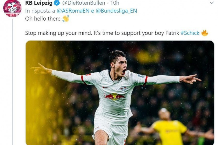 AS Roma FOTO - La Roma: "Chi sosterrete in Bundesliga?". Risponde il Lipsia: "Tifate per Schick!" La società giallorossa ha lanciato ieri un sondaggio sul proprio sito ufficiale. Su Twitter è arrivato il commento della squadra in cui gioca l'attaccante ceco 16/05/2020 - 09:27 VAI ALL'ARTICOLO