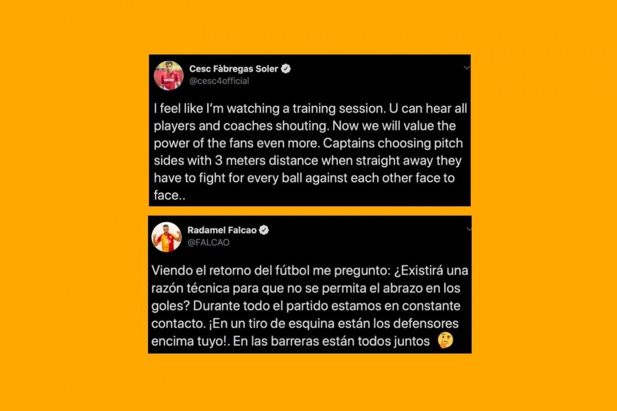 Football Please Coronavirus, Falcao e Fabregas: "Perché non si può esultare con i compagni?" Dopo aver visto i festeggiamenti in Bundesliga, i due calciatori contestano sui social: "Si è costantemente a contatto per tutta la partita" 16/05/2020 - 16:26 VAI ALL'ARTICOLO
